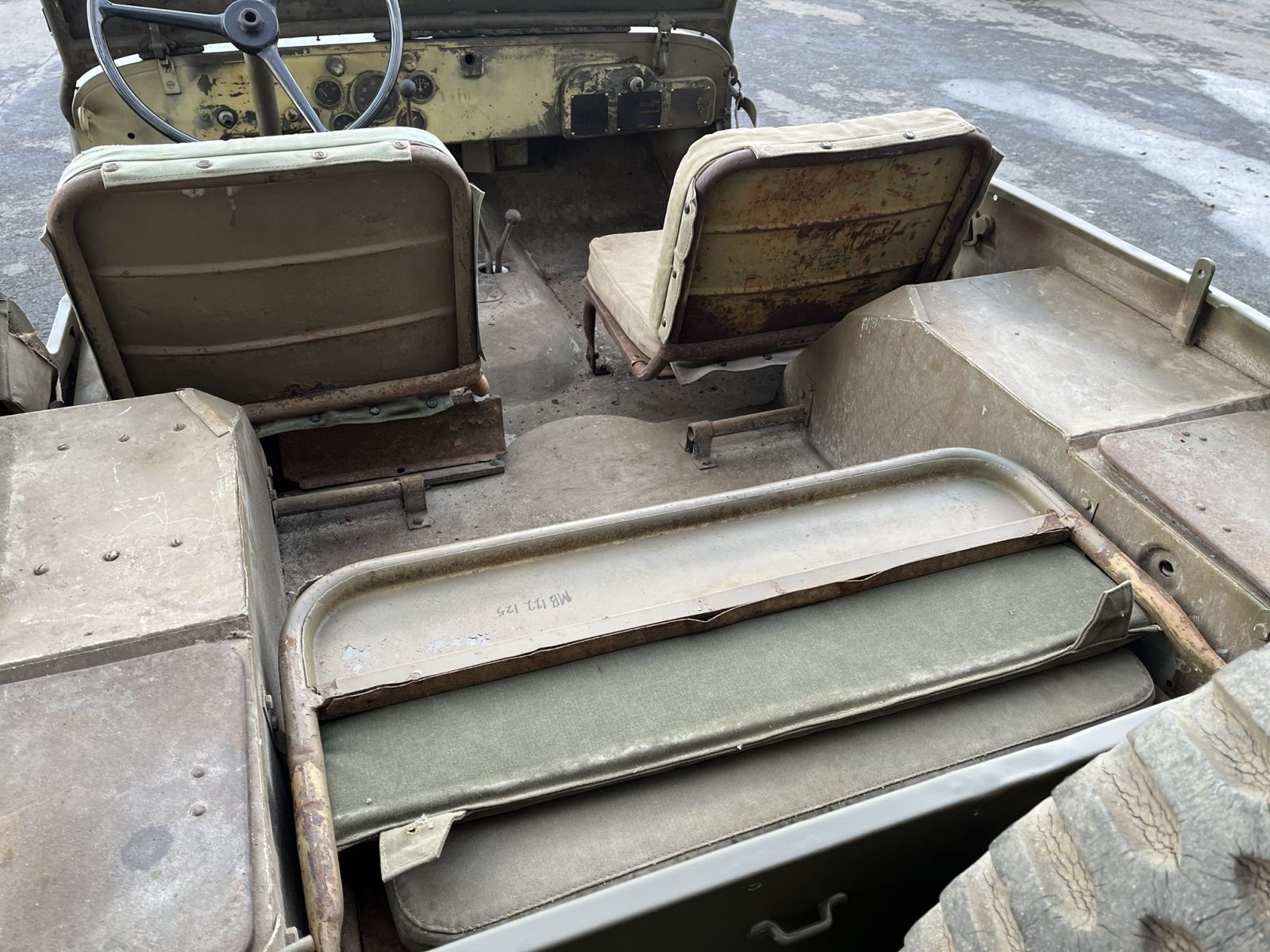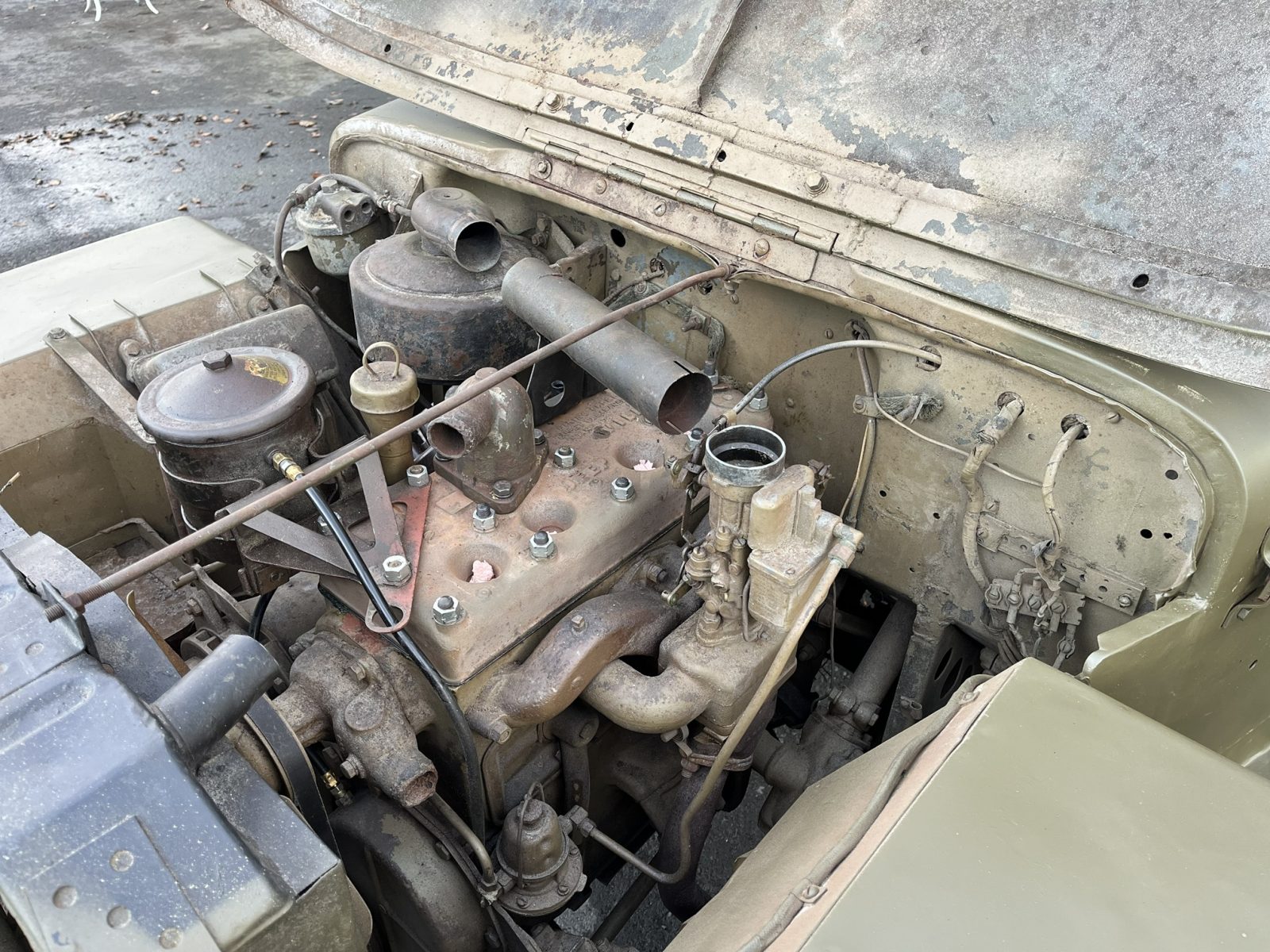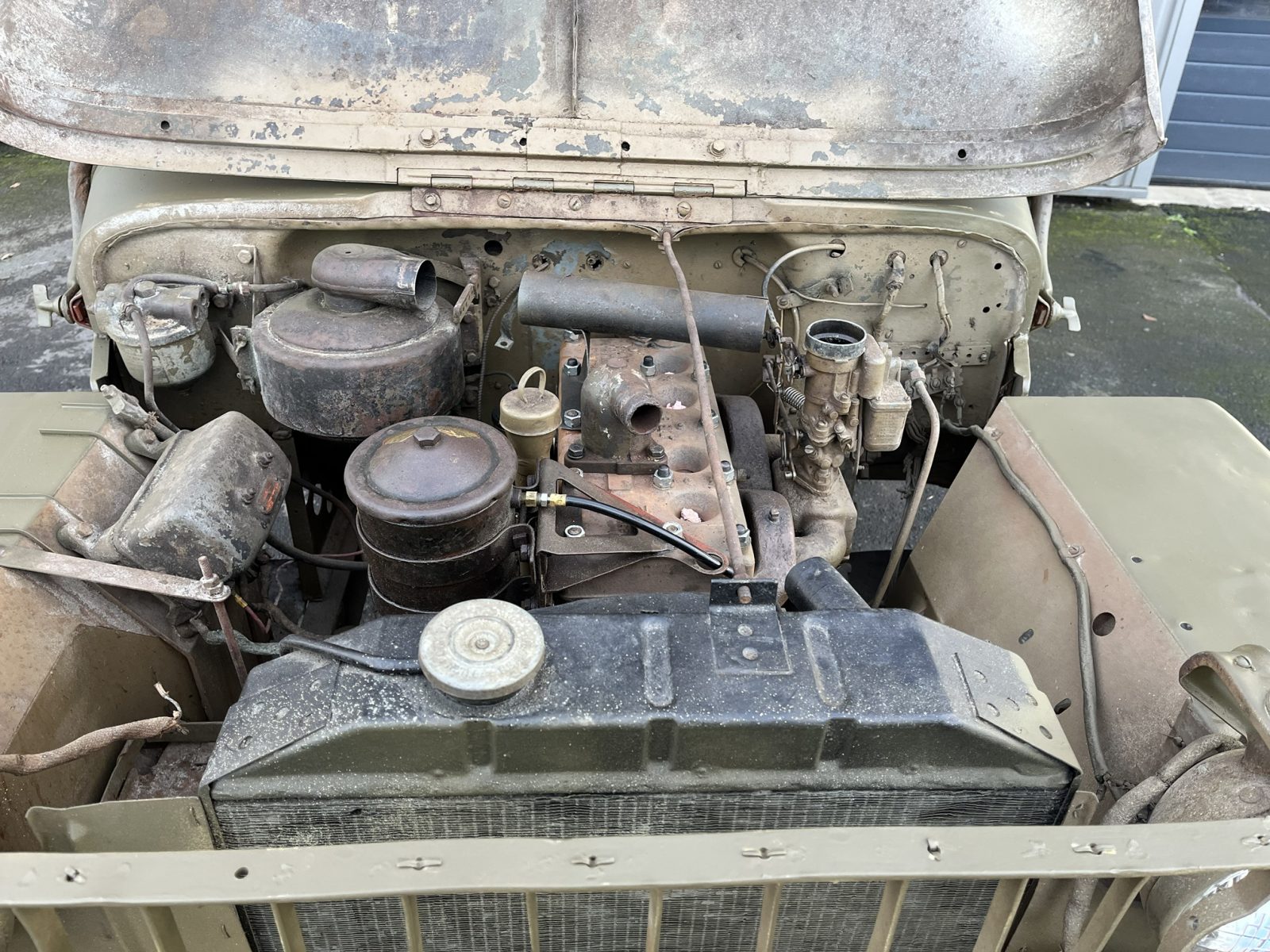 Exceptional “early” Jeep close to its original condition with its specific original parts and details: Sheller bakelite steering wheel, ‘Gas’ fuel gauge, fuel filter, “pancake” air filter, early rear axle, slat grille, engine block, oil filler tube, front seat frames, etc.