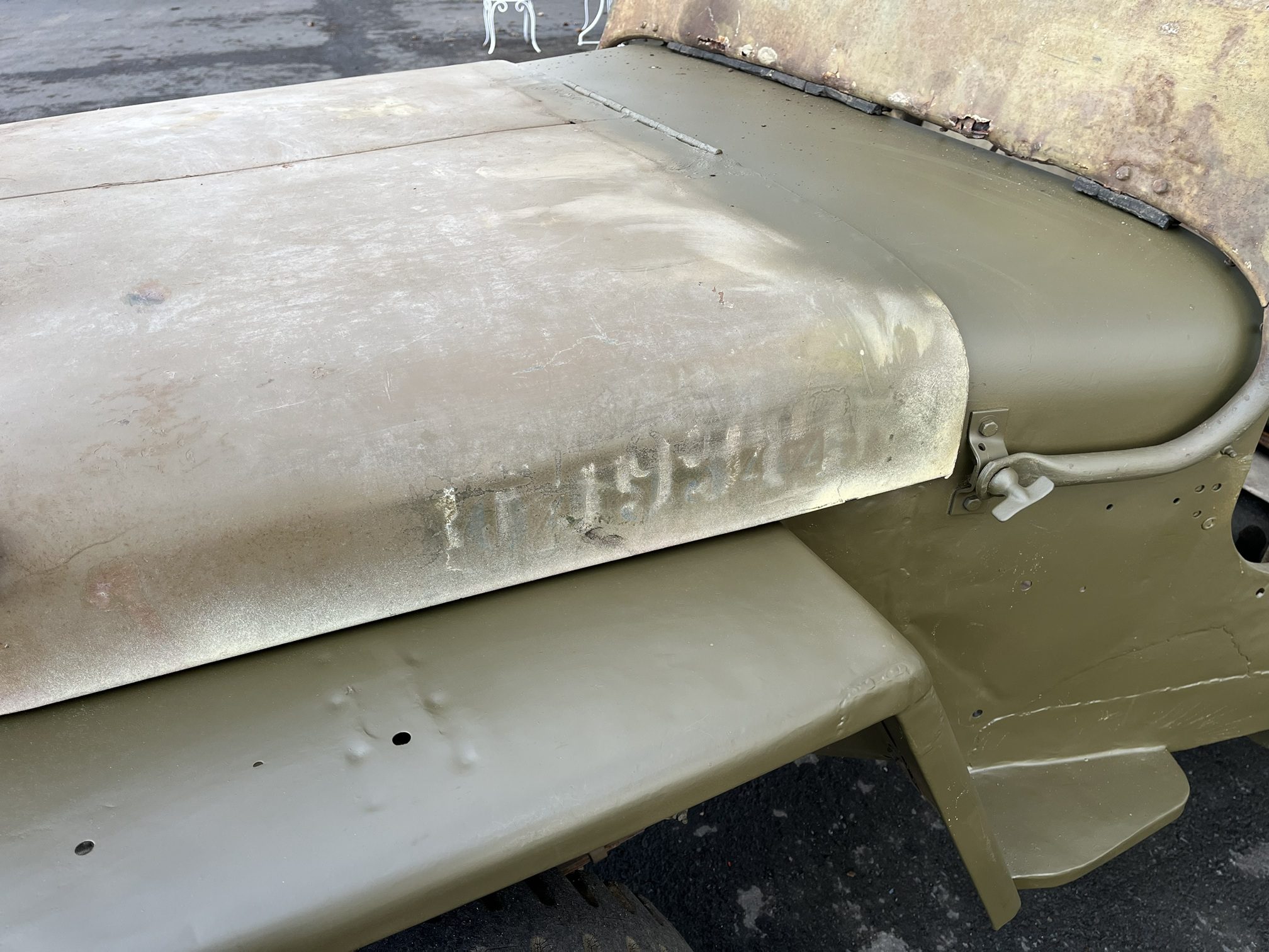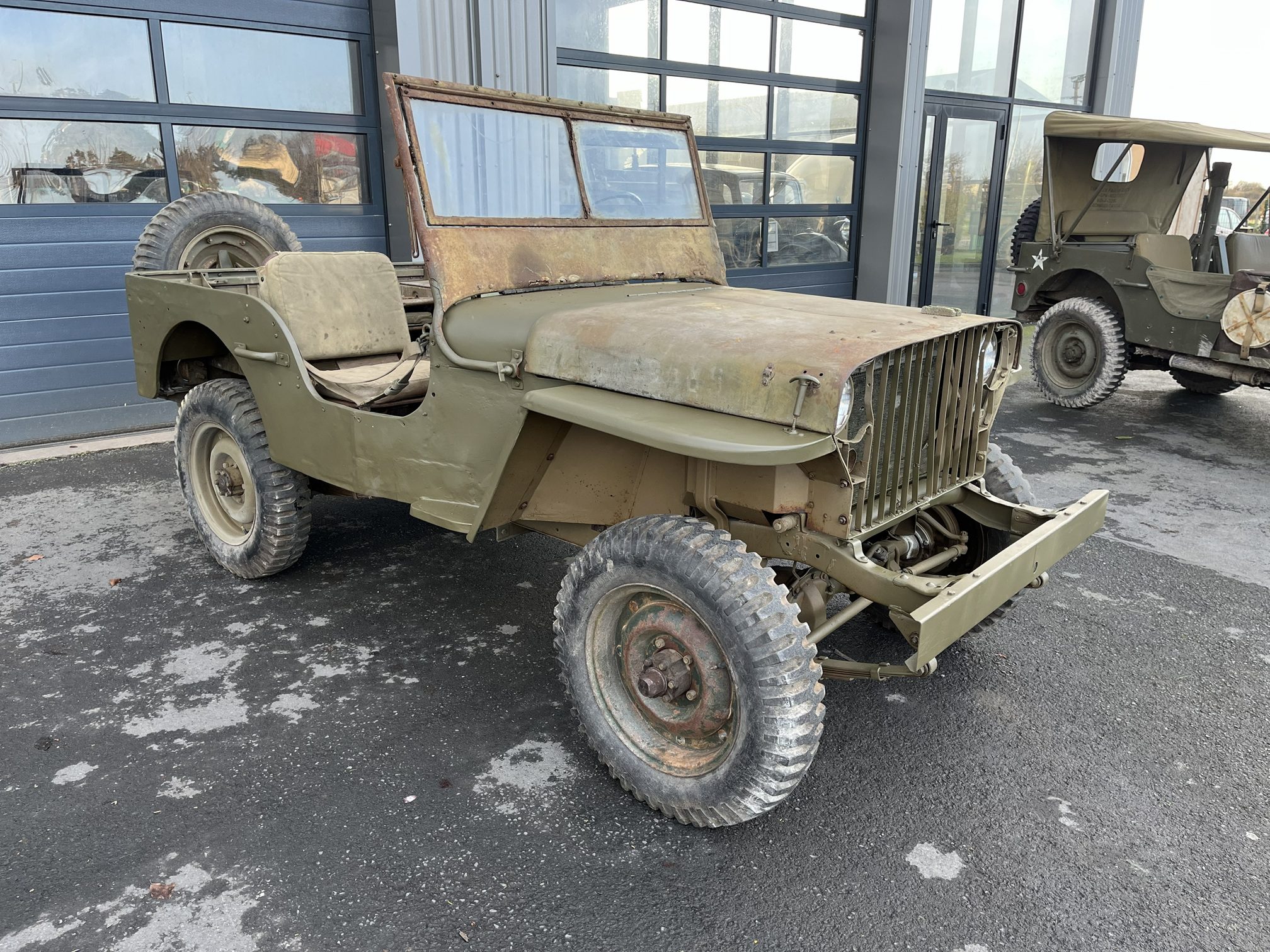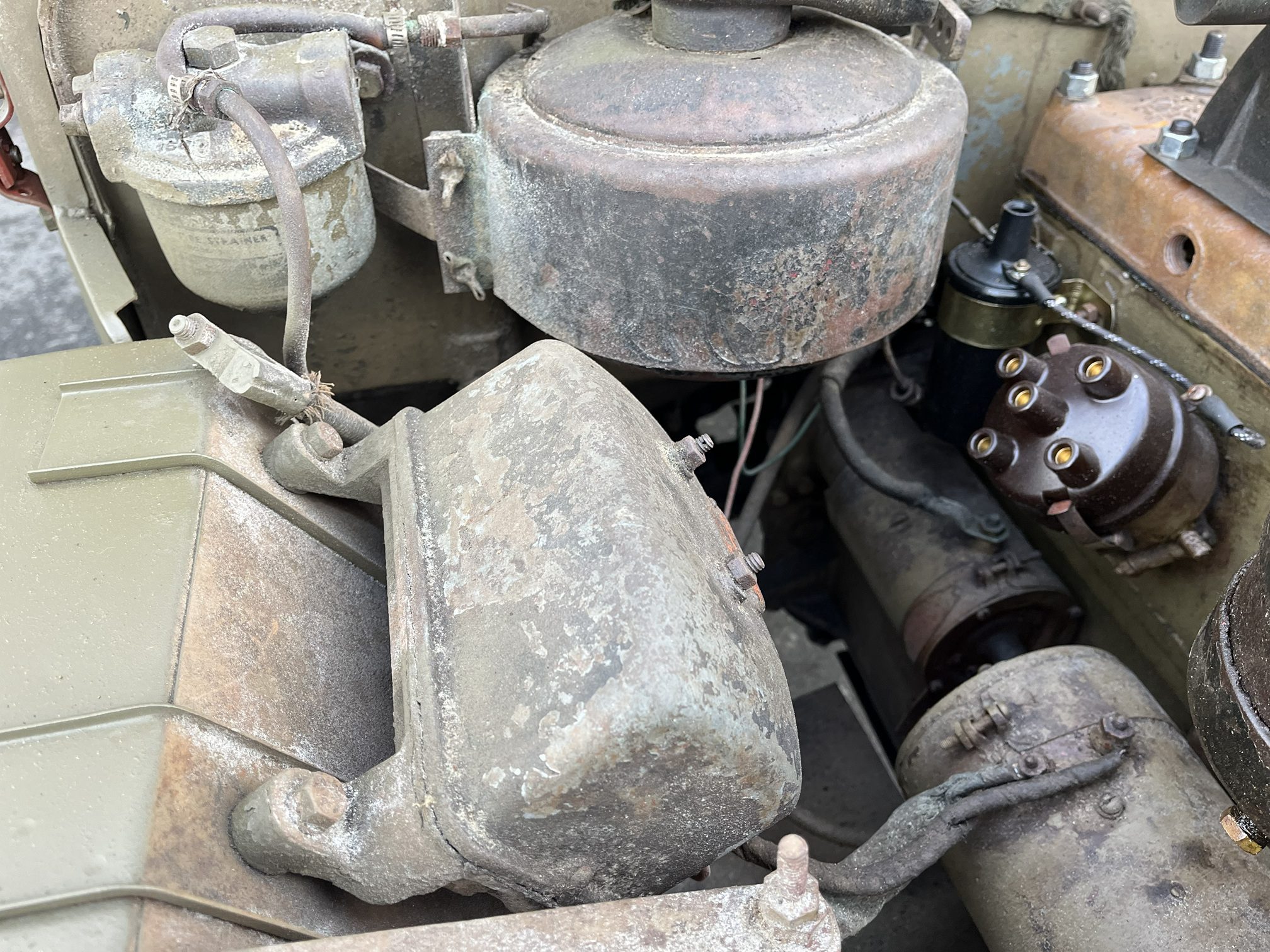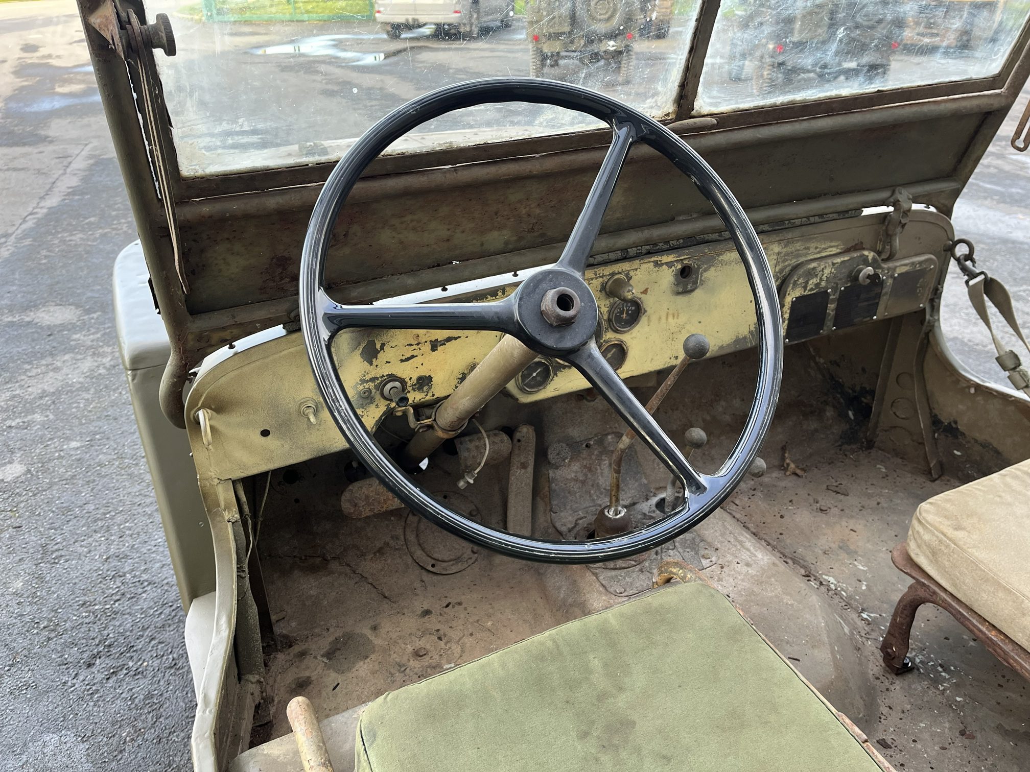 Exceptional “early” Jeep close to its original condition with its specific original parts and details: Sheller bakelite steering wheel, ‘Gas’ fuel gauge, fuel filter, “pancake” air filter, early rear axle, slat grille, engine block, oil filler tube, front seat frames, etc.